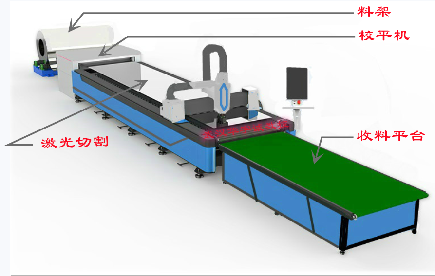 卷料備展開后,經(jīng)過了整平這一工序,材料內(nèi)應(yīng)力便得到了大部分的消除,在通過系統(tǒng)控制的激光切割頭在激光切割平臺上進(jìn)行的三維運(yùn)動切割,實現(xiàn)對金屬帶料的自動落料。